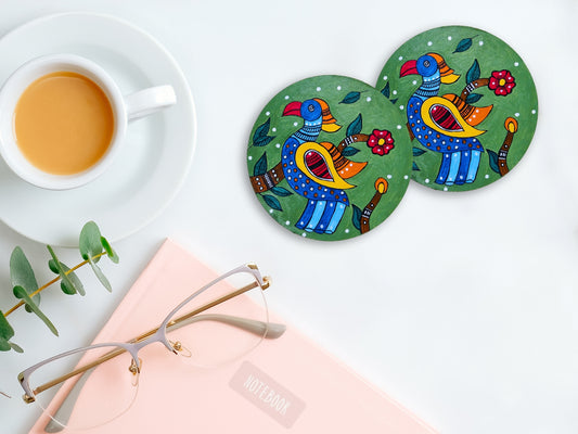 Madhubani Hand Painted Round Wooden Coasters | Set of 2 | Red | Mayur ka joda
