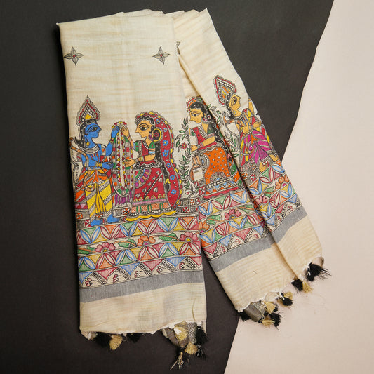 Madhubani Art Cotton Stole with Printed Wedding - Marriage & Patterns in Bloom