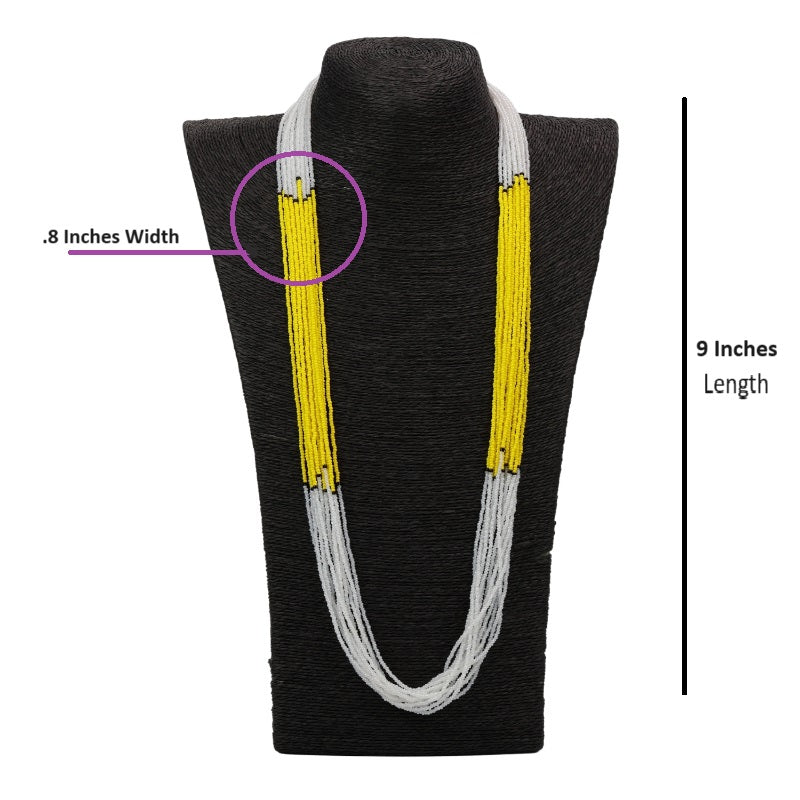 Brighten up your look with this handcrafted Dong Necklace, a beautiful fusion of tradition and modern charm. Adorned with delicate yellow and white beads, this long, layered necklace radiates a refreshing vibrance, making it a perfect statement piece. Inspired by tribal aesthetics, the symmetrical design and smooth finish offer an elegant yet earthy appeal. Whether paired with ethnic wear or styled with contemporary outfits, this beaded necklace adds a touch of bold sophistication.