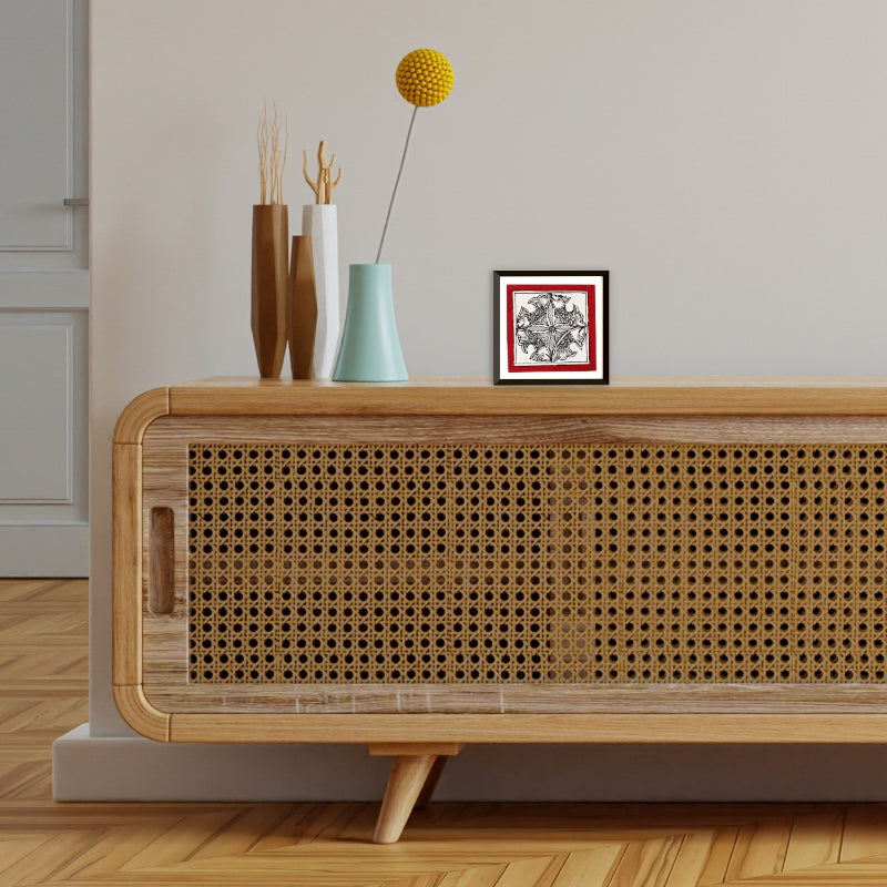 A quartet of intricately detailed fish swim in harmony around a blooming floral mandala. This artwork symbolizes life’s fluid balance and the ever-turning cycle of water and growth—captured in classic kachni monochrome with bold red framing.