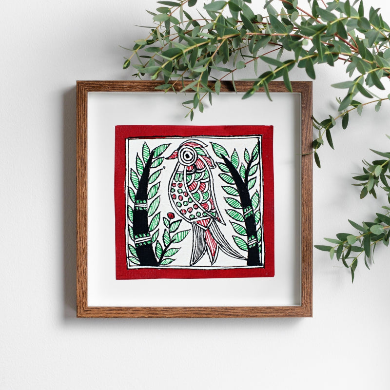 A vivid glimpse of the forest, this charming bird—ornate and observant—perches amidst lush foliage, embodying the essence of Madhubani’s folk storytelling.