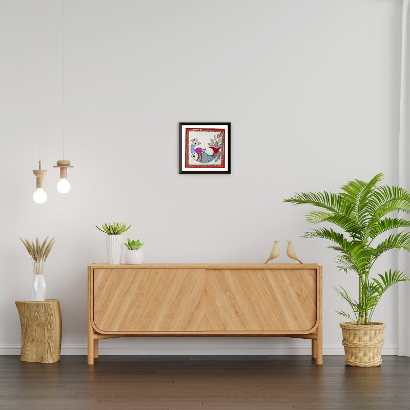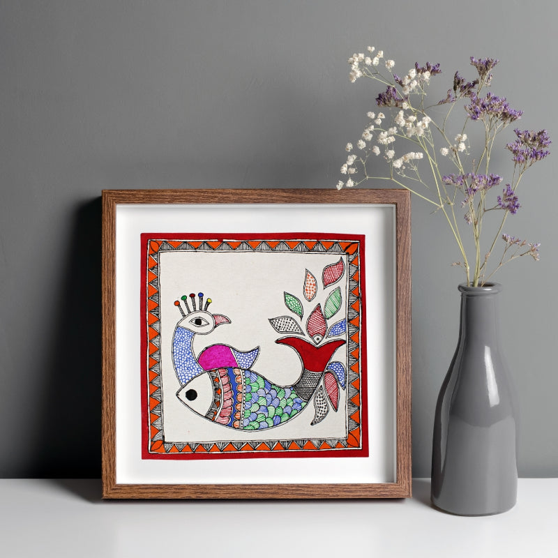 Madhubani Hand Made Painting | Mayur Meen Nritya | 10inch X 10inch with Frame